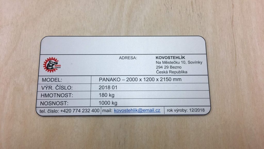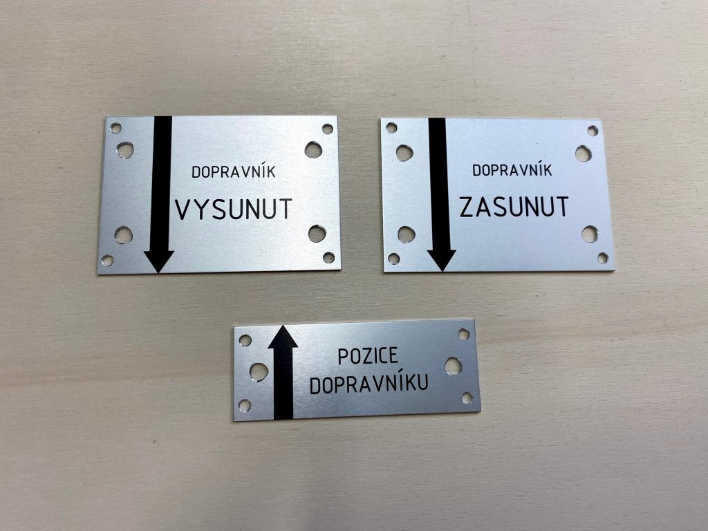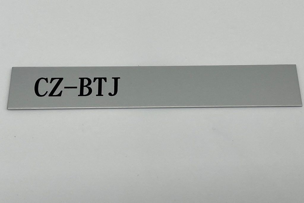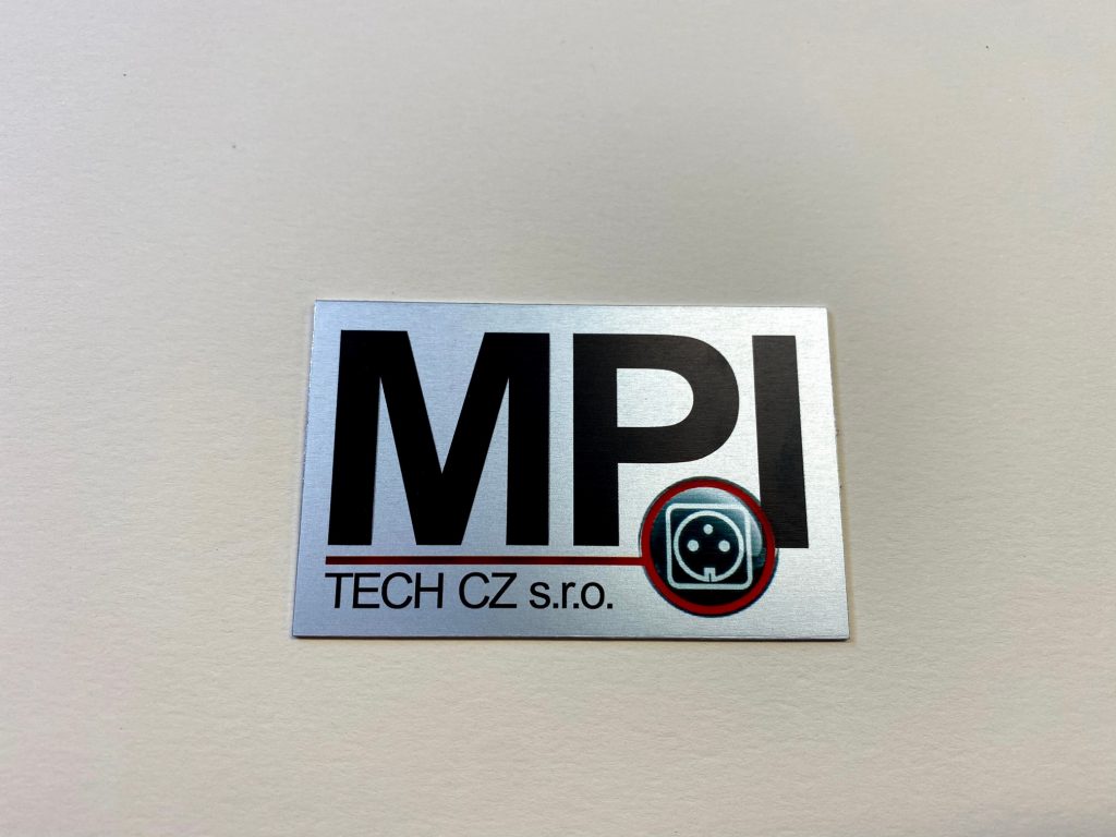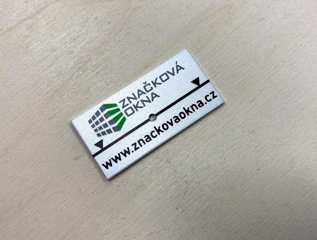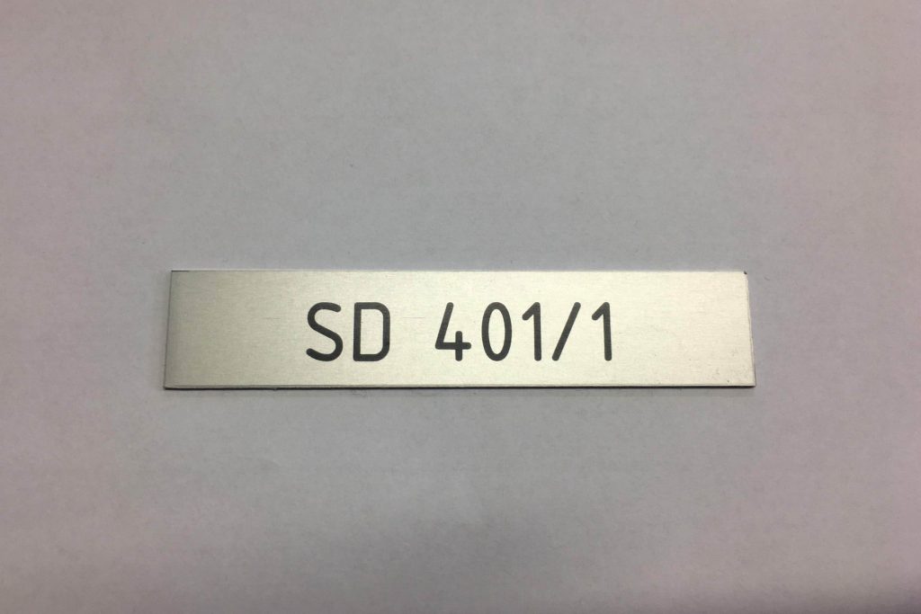 We produce aluminium plaques using two technologies. Laser engraving using CO2 or fibre laser, when anodised natural or coloured aluminium sheet is laser engraved, which evaporates the aluminium oxide layer and exposes the natural colour of the sheet. These labels have only two colours, the surface colour of the anodised sheet and the light grey colour after engraving. The labels have good mechanical resistance, which is due to the properties of the anodised sheet, but only two colours.