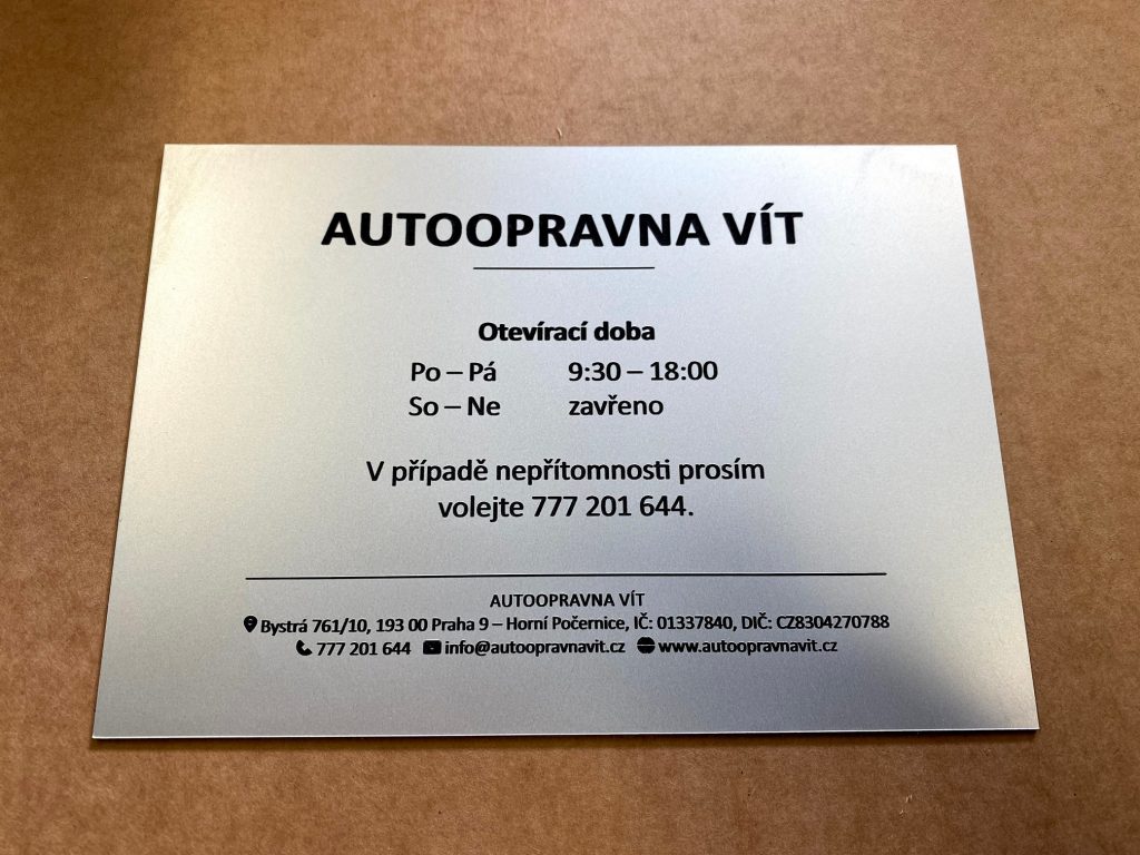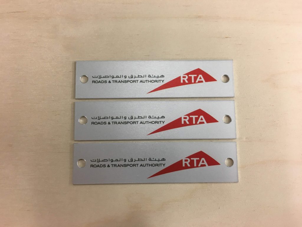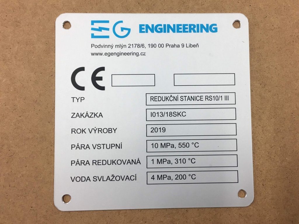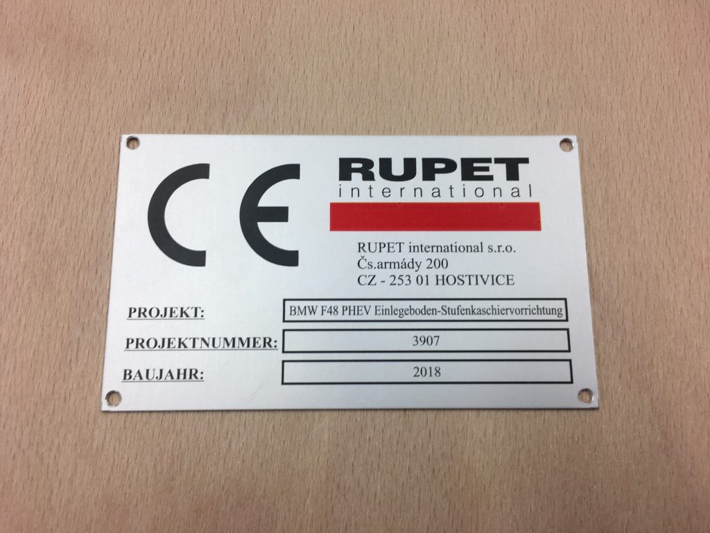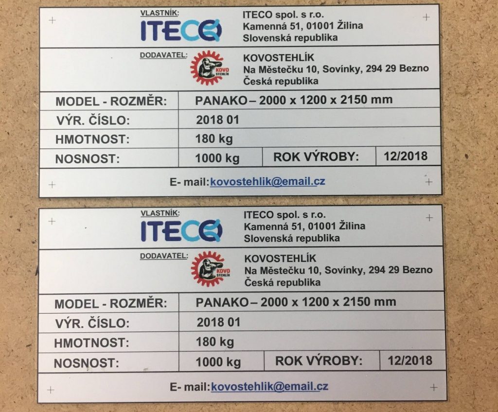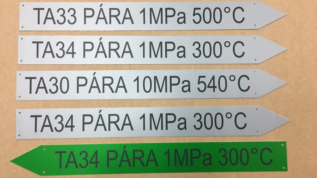 We produce aluminium plaques using two technologies. Laser engraving using CO2 or fibre laser, when anodised natural or coloured aluminium sheet is laser engraved, which evaporates the aluminium oxide layer and exposes the natural colour of the sheet. These labels have only two colours, the surface colour of the anodised sheet and the light grey colour after engraving. The labels have good mechanical resistance, which is due to the properties of the anodised sheet, but only two colours.