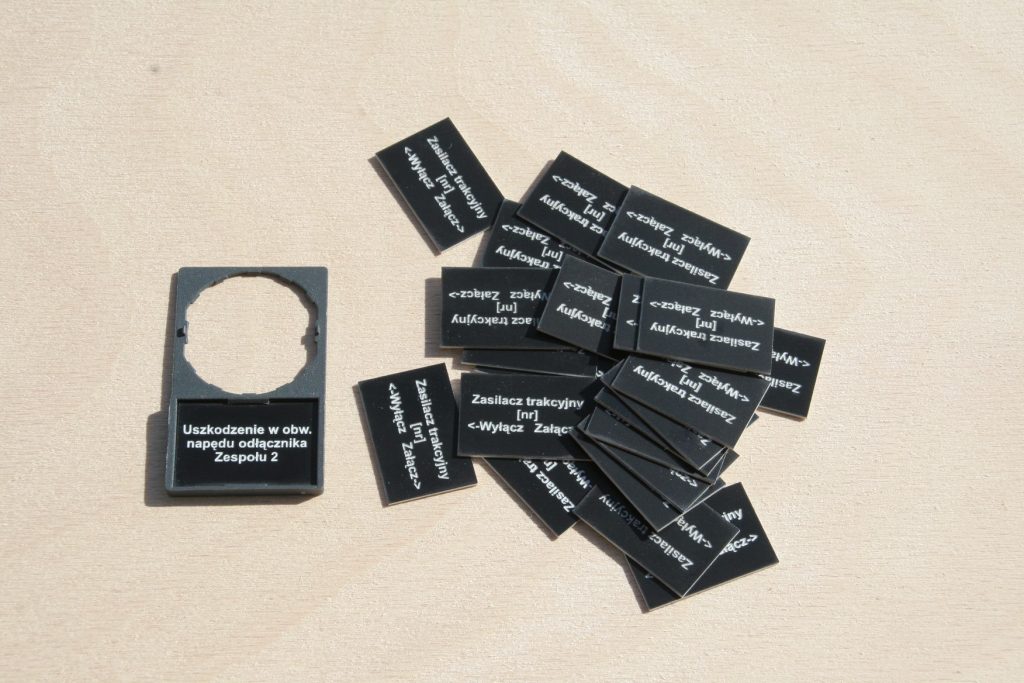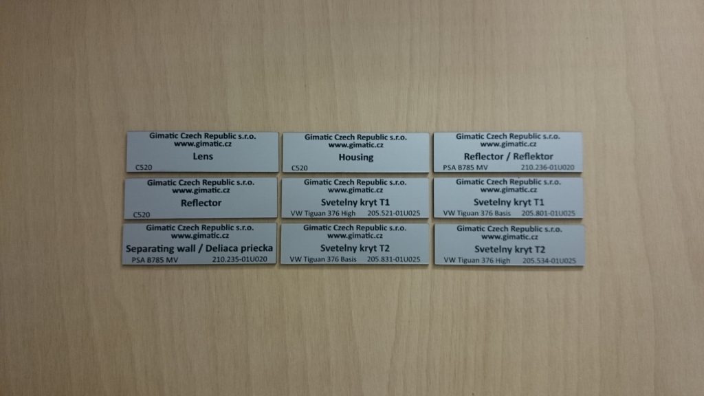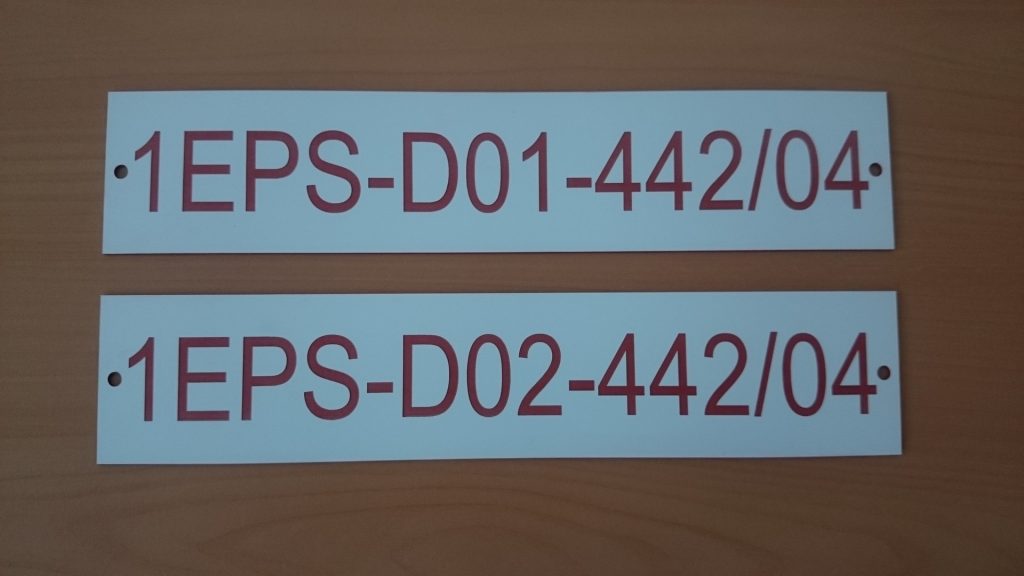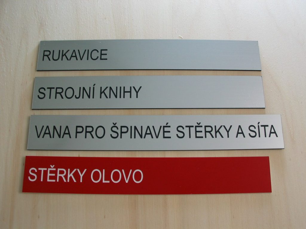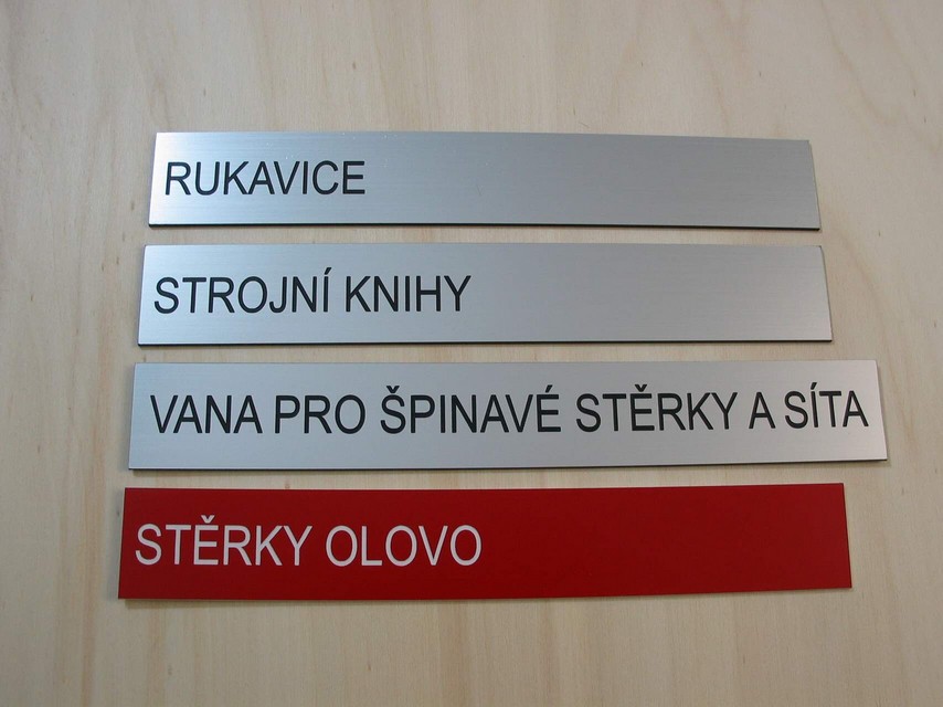 Plastové štítky vyrábíme gravírováním a řezáním dvouvrstvých plastů. Dvouvrstvé plasty jsou plastové desky na bázi mikroakrilátu, které mají jádro jedné barvy, které definuje barvu gravury/textu a to nejčastěji bílé nebo černé a tenkou vrstvu vrchní barvy / bílou, černou, žlutou, červenou, metalickou atd/, která definuje barvu pozadí štítku nebo cedulky. Laser odpaří vrchní barvu a odhalí barvu jádra. Díky výborné zpracovatelnosti laserem je možné plast po gravírování řezat bez omezení tvaru. Stroj štítek nejdříve vygravíruje a poté vyřízne otvory a tvar štítku dle požadavku zákazníka. V případě nutnosti mít štítek výcebarevný je možné desku potisknout na UV tiskárně a vyříznout na laseru.